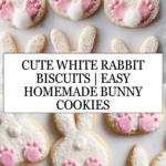 Delightfully charming and delicious White Rabbit Biscuits featuring buttery, crumbly cookies decorated with creamy icing, desiccated coconut, and mini marshmallow tails. Perfect for tea-time treats or festive occasions, these homemade biscuits showcase an inviting combination of textures and a fun rabbit motif.