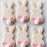 Delightfully charming and delicious White Rabbit Biscuits featuring buttery, crumbly cookies decorated with creamy icing, desiccated coconut, and mini marshmallow tails. Perfect for tea-time treats or festive occasions, these homemade biscuits showcase an inviting combination of textures and a fun rabbit motif.